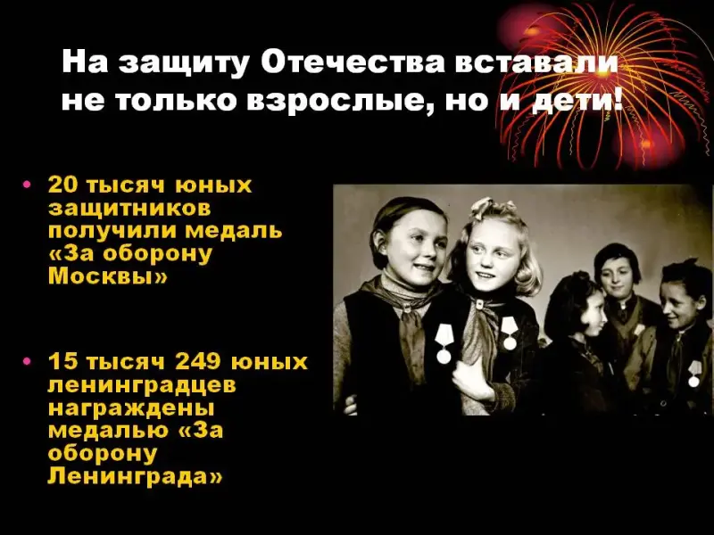 Ведущий.(Слайд 13) На фронтах и в партизанских отрядах наравне со взрослыми сражались дети. 20 тысяч юных защитников получили медаль «За оборону Москвы». 15 тысяч 249 юных ленинградцев награждены медалью «За оборону Ленинграда». Многие юные герои пали смертью храбрых. Звания Героев Советского Союза были посмертно удостоены: Лёня Голиков, Валя Котик, Марат Казей, Зина Портнова….