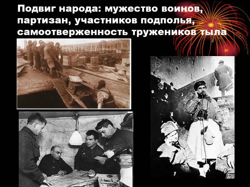 Ведущий. На защиту Родины встал весь народ, именно от мала до велика. Солдаты, партизаны, труженики тыла проявляли героизм и самоотверженность, защищая свою Родину. (Слайды 14, 15)
