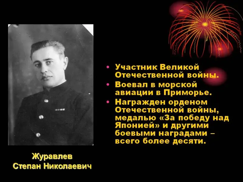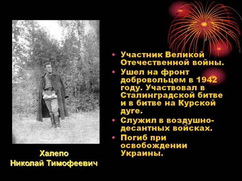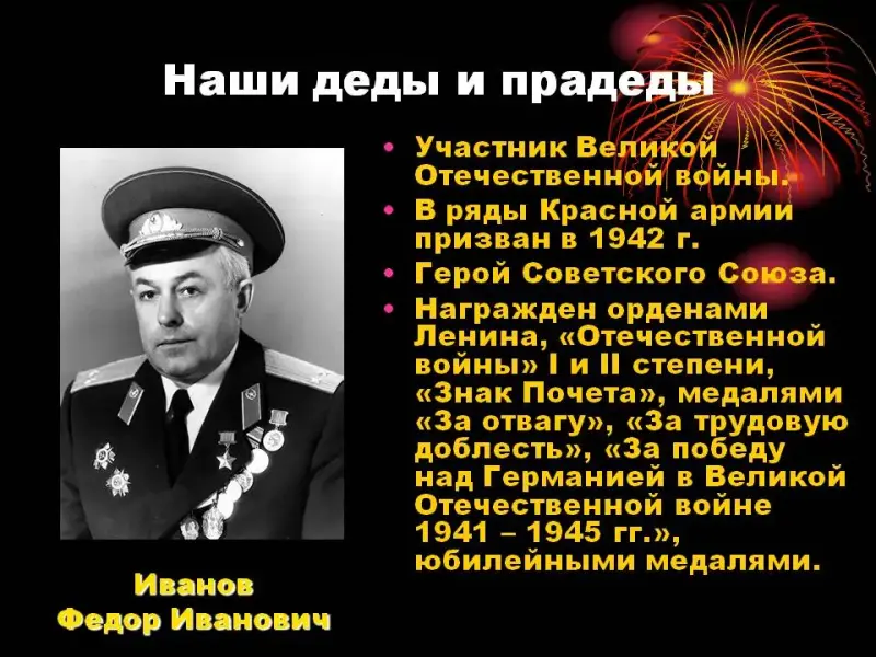 Ведущий. В каждой семье бережно хранят память об участниках Великой Отечественной войны. (Рассказы учеников о подвигах своих родственников.) (Слайды 21-24)