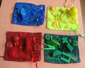 Воспитатель перемешивает игрушки разных цветов и предлагает разложить их в мешочки соответствующего цвета.
