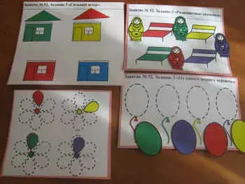 В. "От какого шарика веревочка". (Цвет шарика соотносить с цветом веревочки)