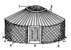 Калмыцкая кибитка состоит из следующих частей: шесть складных решеток, дверь с двумя створками, шестьдесят шестов и круглый дымоход.