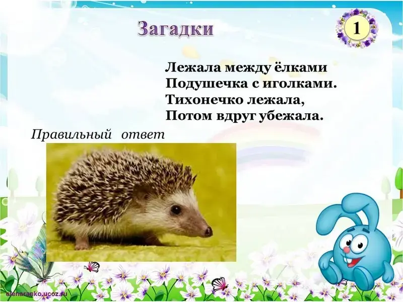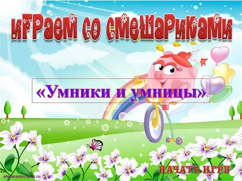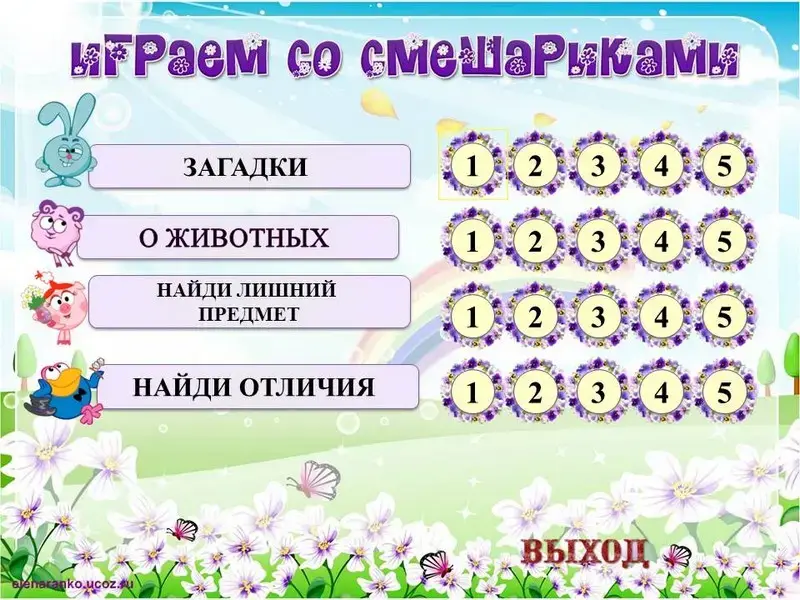 Давайте посмотрим на экран: мы видим, что каждый смешарик будет представлять номинацию, за каждой цифрой скрывается вопрос, а если мы нажмем на бабочку узнаем правильный ответ, далее если нажмем на смешарика он вернет нас к номинациям.