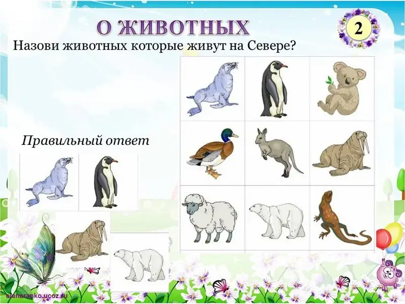 Ответ: морж, морской котик, пингвин, белый медведь.