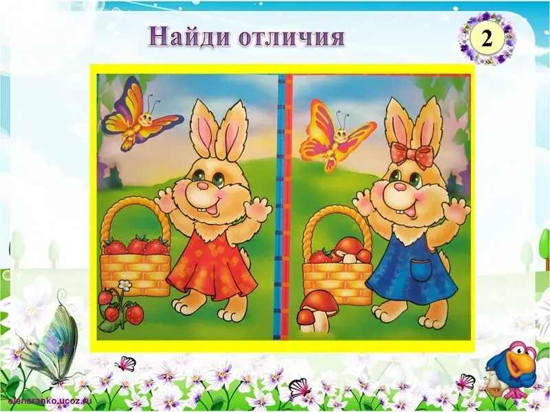 - 6 отличий (бабочка, корзинка, бантик, грибы, деревья платье)