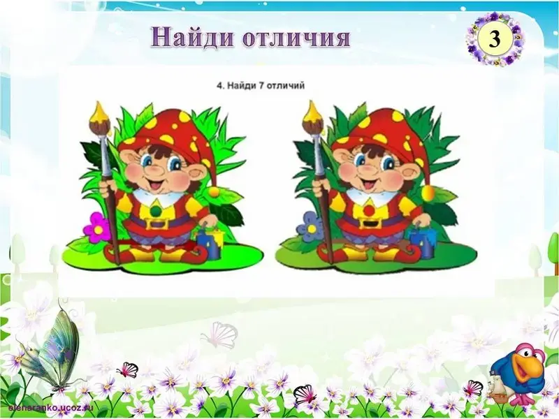 - 7 отличий (листики, пуговица, Цветок, краска.ботинки. земля, кисточка на колпаке)