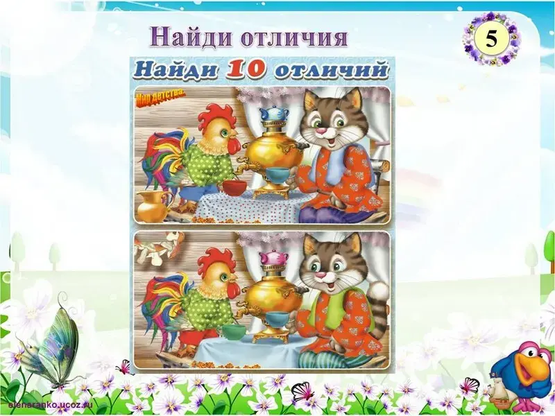 - 10 отличий (грибы, чашки, скатерть, чайник маленький, жилетка у Кота, брюки у кота, брюки у петуха, занавеска с колечком, кувшин, глаза у кота)