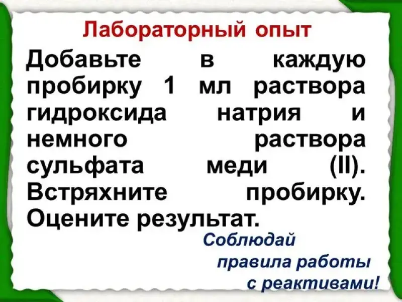 Проведём экспертизу неизвестных веществ в пробирках с помощью биуретовой реакции. Приступайте к выполнению лабораторного опыта по инструкции. (Слайд 9)