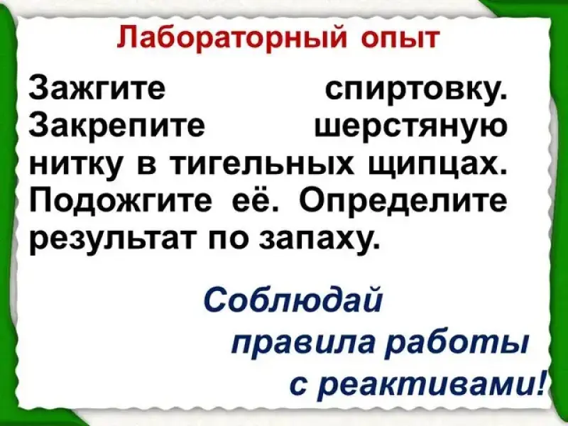 - На ученических столах: пробирки с веществами (№1 - яичный белок, мясной бульон, молоко, №2 - бульонный кубик), медная проволока, шерстяная нитка, спиртовка, спички; задания.
