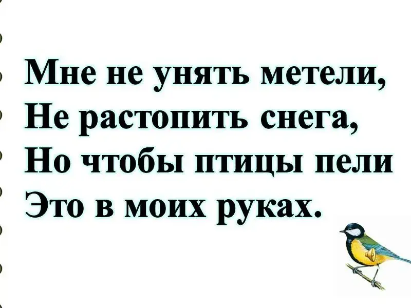 - О том, что не в наших силах унять метель и растопить снега, но мы можем помочь птицам не замерзнуть зимой и весной порадовать своим пением.