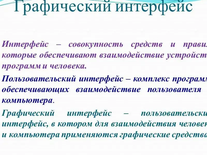Графический интерфейс позволяет осуществлять взаимодействие человека с компьютером в форме диалога с использованием окон, меню и элементов управления (диалоговых панелей, кнопок и так далее).