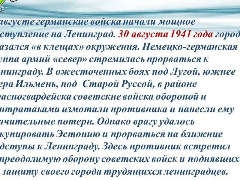 Под руководством Военного совета Ленинградского фронта, партийных и советских организаций Ленинграда и области вокруг города создается система оборонительных сооружений, формируется народное ополчение, в тылу врага партизанские отряды.8 сентября немецко-фашистским войскам удалось прорваться к Ладожскому озеру, захватить Шлиссельбург (Петрокрепость) и перерезать сухопутные коммуникации, связывающие Ленинград со страной. Враг пытался штурмом овладеть городом, но был отбит и остановлен на ближних юго-западных и южных подступах к нему. Началась героическая эпопея борьбы армии, трудящихся Ленинграда, ВМФ в тяжелейших условиях блокады, длившейся почти 900 дней и вошедшей в историю как непревзойденный пример воинской и гражданской доблести, стойкости и массового героизма советских людей (кинохроника - см. слайд № 42).