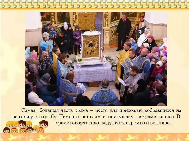 Слайд №10. Самая большая часть храма - место для прихожан, собравшихся на церковную службу. Немного постоим и послушаем - в храме тишина. В храме говорят тихо, ведут себя скромно и вежливо.