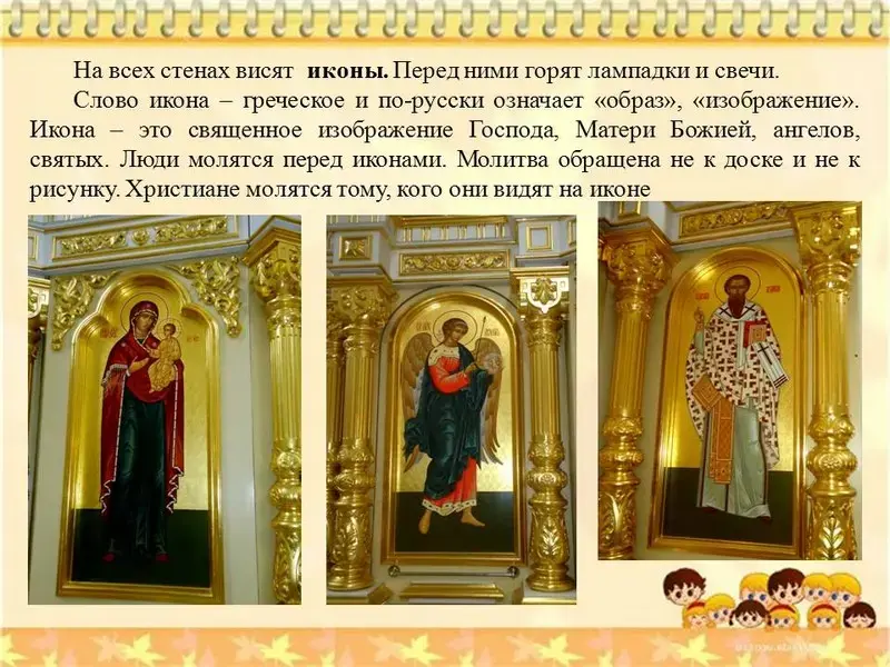 Слово икона - греческое и по-русски означает "образ", "изображение". Икона - это священное изображение Господа, Матери Божией, ангелов, святых. Люди молятся перед иконами. Молитва обращена не к доске и не к рисунку. Христиане молятся тому, кого они видят на иконе.