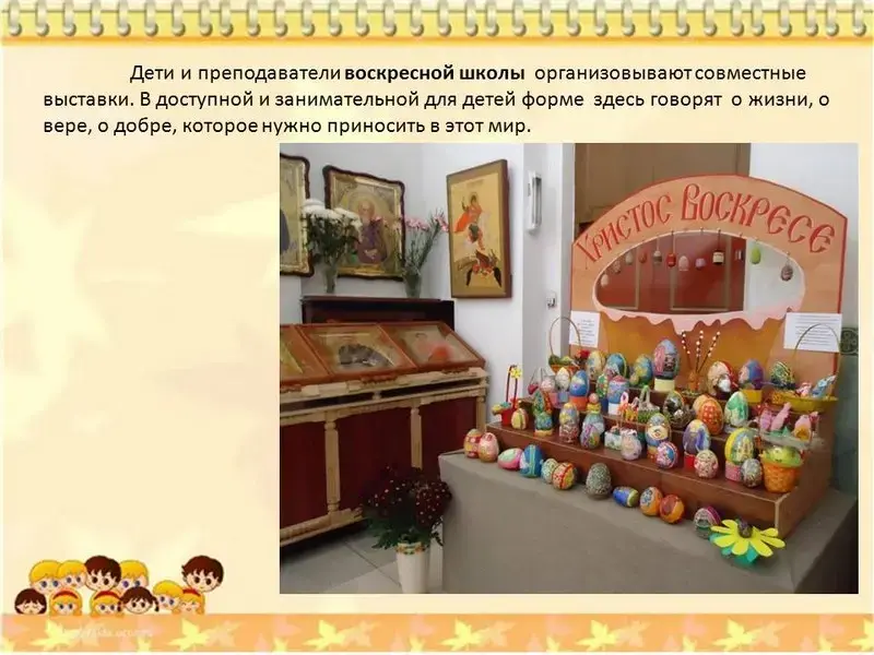 Слайд №19. А сейчас мы пройдём в православную библиотеку и в воскресную школу, где нас встретят преподаватели воскресной школы и ответят на ваши вопросы. В доступной и занимательной для детей форме они говорили о жизни, о вере, о добре, которое нужно приносить в этот мир. И откуда они только черпали свои поучительные истории? Кажется, сокровищница их мудрости не имеет дна.