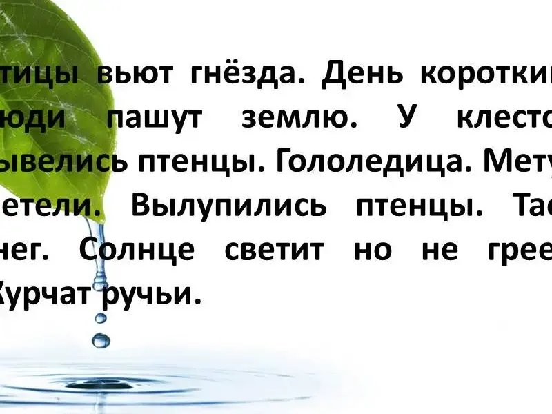 Птицы вьют гнёзда. День короткий. Люди пашут землю. У клестов вывелись птенцы. Гололедица. Метут метели. Вылупились птенцы. Тает снег. Солнце светит но не греет. Журчат ручьи. (слайд 2)