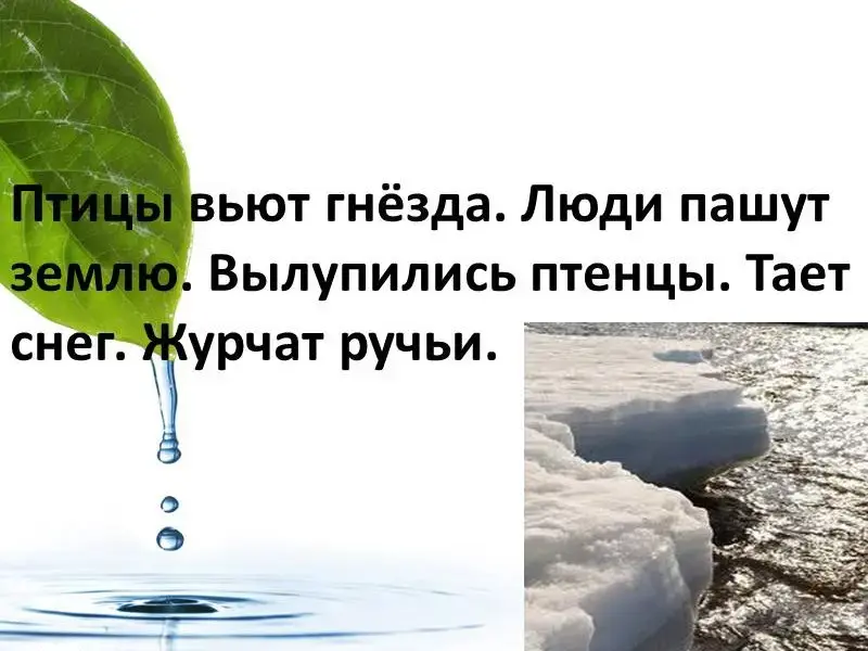 Птицы вьют гнёзда. Люди пашут землю. Вылупились птенцы. Тает снег. Журчат ручьи. (слайд 3)