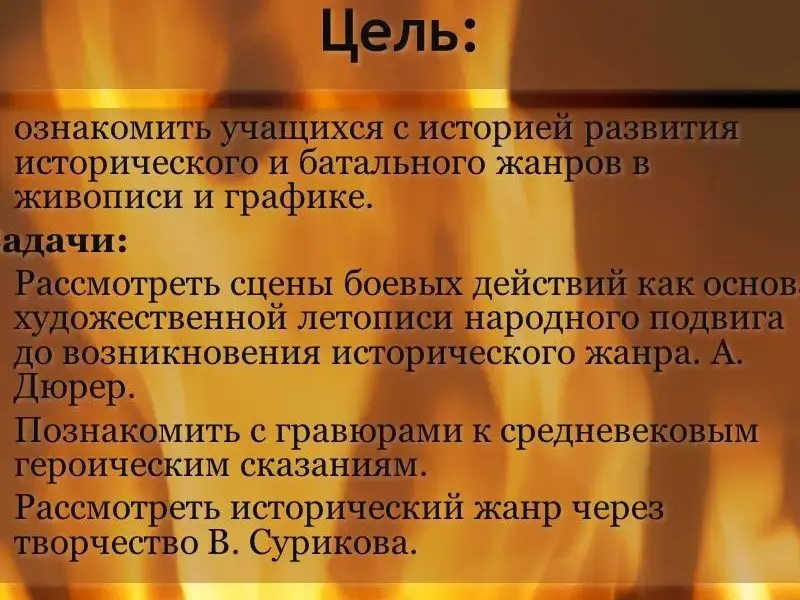 Цель: ознакомить учащихся с историей развития исторического и батального жанров в живописи и графике.