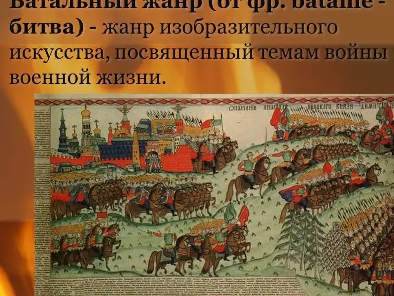 Батамльный жанр (от фр. bataille - битва) - жанр изобразительного искусства, посвященный темам войны и военной жизни. Главное место в батальном жанре занимают сцены сухопутных, морских сражений и военных походов. Художник стремится запечатлеть особо важный или характерный момент битвы, показать героику войны, а часто и раскрыть исторический смысл военных событий, что сближает батальный жанр с историческим. А сцены военного быта (в походах, казармах, лагерях) зачастую связывают его с бытовым жанром. (слайд 9)