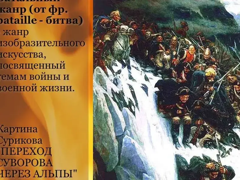 Русский батальный жанр (картины батальная живопись) проникнут особым духом патриотизма, стремится выразить преклонение перед героизмом и мужеством воинов. Победы Суворова и Кутузова вдохновляли русских художников живописцев на написание картин и полотен прославляющих мужество и героизм русских воинов.