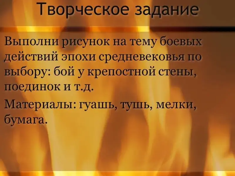 Выполни рисунок на тему боевых действий эпохи средневековья по выбору: бой у крепостной стены, поединок и т.д.