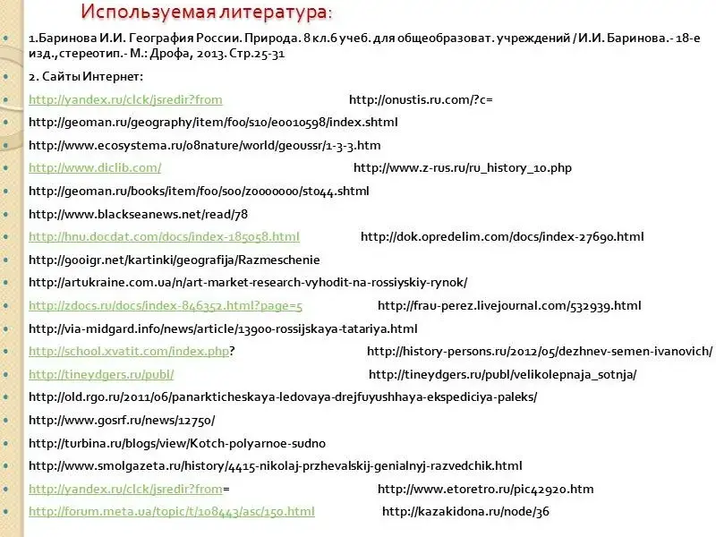 1.Баринова И.И. География России. Природа. 8 кл.6 учеб. для общеобразоват. учреждений / И.И. Баринова.- 18-е изд., стереотип.- М.: Дрофа, 2013. Стр.25-31
