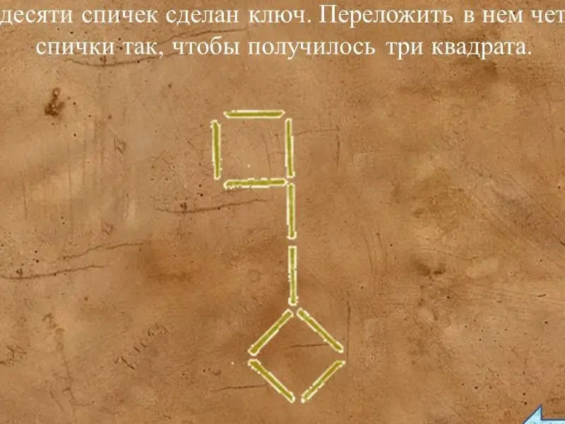 Из десяти спичек сделан ключ. Переложить в нем четыре спички так, чтобы получилось три квадрата.