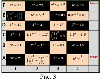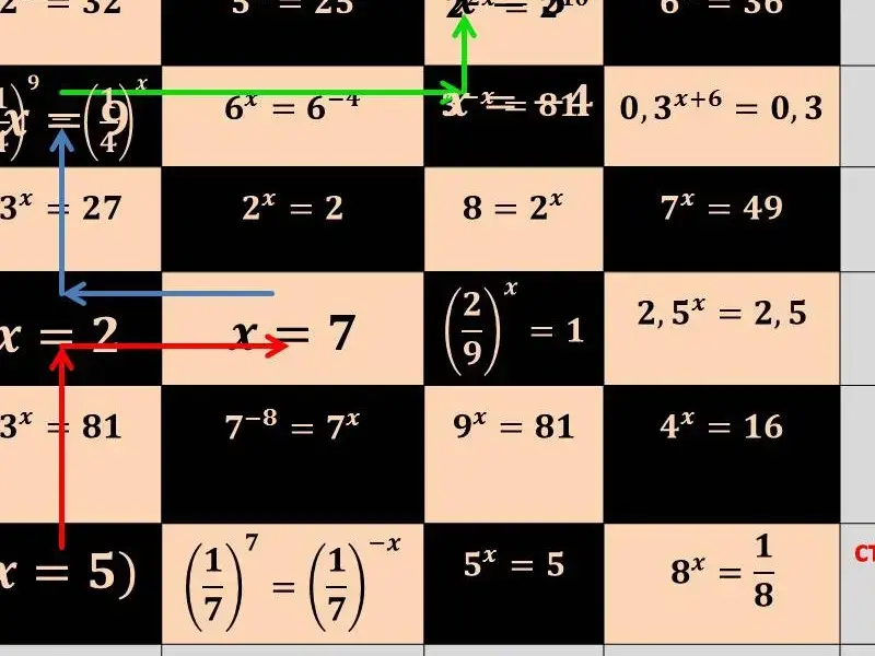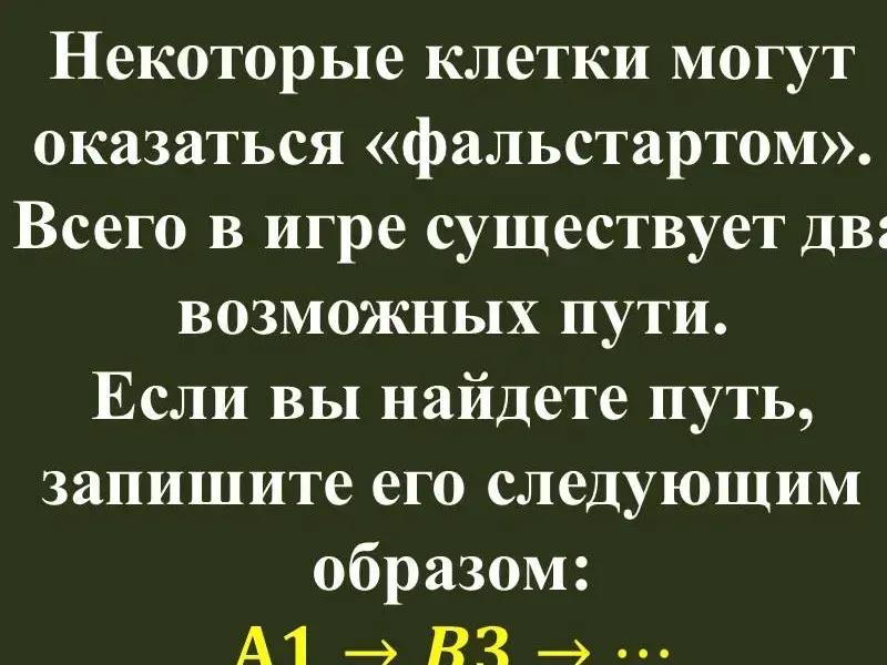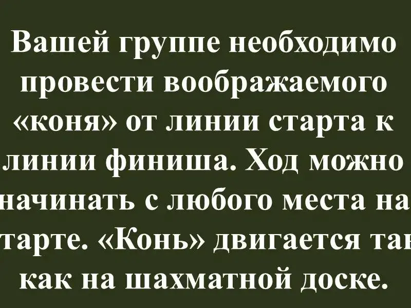 Вашей группе необходимо провести воображаемого "коня" от линии старта к линии финиша. Ход можно начинать с любого места на старте. "Конь" двигается так, как на шахматной доске. Но нужно соблюдать одно условие: число, которое является решением уравнения в клетке старта или там, где стоит "конь", сложенное с числом, которое является решением уравнения в клетке, где "конь" делает поворот, должно дать число, которое является решением уравнения куда прыгает "конь". Некоторые клетки могут оказаться "фальстартом". Всего в данной игре существует два возможных пути.