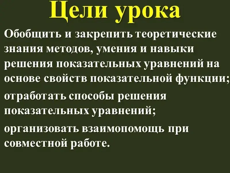 Формулировка целей классу: обобщить пройденный материал, вспомнить способы решения показательных уравнений, применить полученные знания для решения сложных задач.