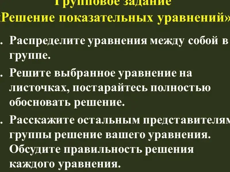 На этом этапе группы отчитываются по групповому заданию "Решение показательных уравнений" (конверт №3).