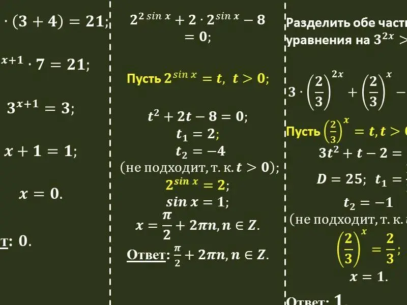 | Приведение к одному основанию | Вынесение общего множителя за скобки | Замена переменной (приведение к квадратному) |