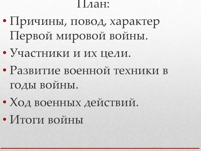 - Раскрыть причины, цели участников, характер войны; выяснить какую роль в ходе военных действий сыграл военно-технический потенциал воюющих стран; назвать главные фронты и события.