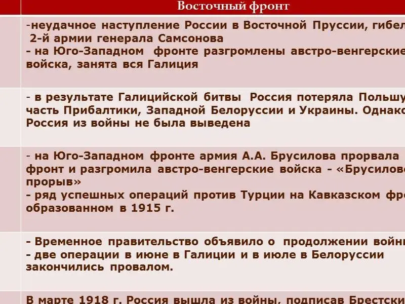 Брусиловский прорыв. В мае 1916 г. войска русского Юго-Западного фронта под командование генерала Брусилова осуществили прорыв австрийских позиций, отбросив противника на 120 км, фронт был прорван на протяжении 340 км. Русские войска заняли Луцк, Черновцы. Брусиловский прорыв поставил Австро-Венгрию на грань катастрофы. Германия перебросила с запада 11 дивизий, остановив наступление у Вердена.