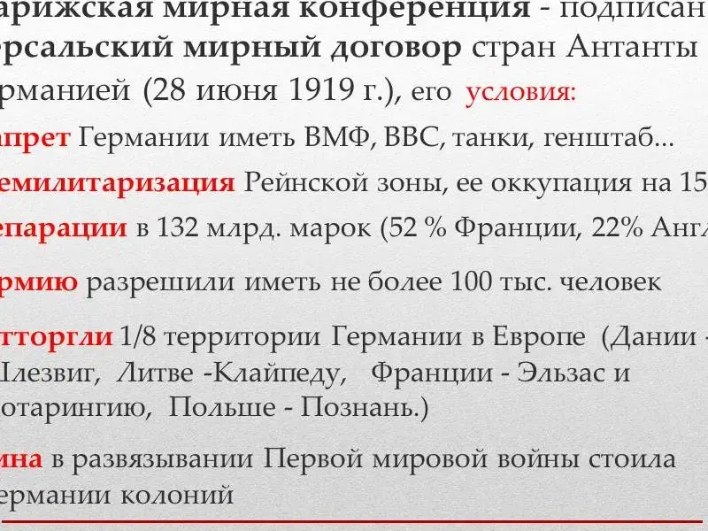 28 июня 1919 г. после длительных обсуждения на Парижской мирной конференции был подписан Версальский мирный договор стран Антанты с Германией. (слайд 17)