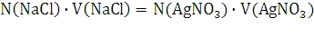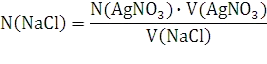 Концентрацию раствора хлорида натрия вычисляют исходя из закона эквивалентов - все вещества взаимодействуют друг с другом в количествах, пропорциональных их эквивалентам: