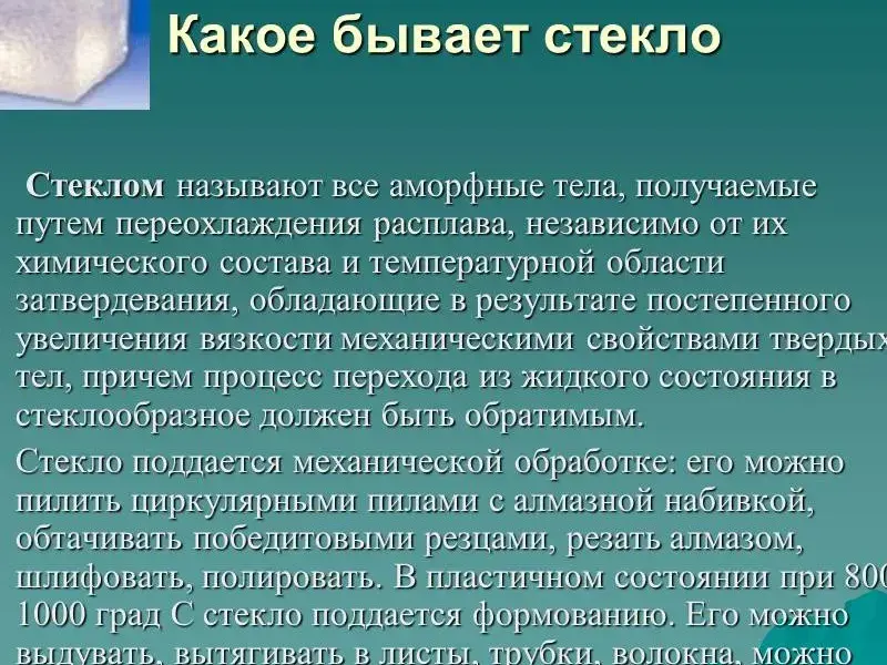 | 1. Внешние признаки | Твердое тело сохраняет форму и объем, плоские грани, постоянство углов между ними, симметрия | Твердое тело, имеет форму, но со временем кристаллизуется (помутнение стекла) |