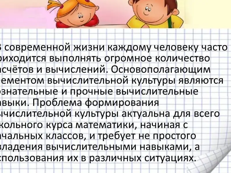 В современной жизни каждому человеку часто приходится выполнять огромное количество расчётов и вычислений. Поэтому цель моей работы - показать лёгкие, быстрые и точные методы счёта, которые не только помогут вам во время каких-либо расчётах, но вызовут немалое удивление у знакомых и товарищей, ведь свободное выполнение счётных операций в значительной степени может свидетельствовать о незаурядности вашего интеллекта. Основополагающим элементом вычислительной культуры являются сознательные и прочные вычислительные навыки. Проблема формирования вычислительной культуры актуальна для всего школьного курса математики, начиная с начальных классов, и требует не простого овладения вычислительными навыками, а использования их в различных ситуациях. Владение вычислительными умениями и навыками имеет большое значение для усвоения изучаемого материала, позволяет воспитывать ценные трудовые качества: ответственное отношение к своей работе, умение обнаруживать и исправлять допущенные в работе ошибки, аккуратное исполнение задания, творческое отношение к труду. Однако, в последнее время уровень вычислительных навыков, преобразований выражений имеет ярко выраженную тенденцию к снижению, учащиеся допускают массу ошибок при подсчетах, все чаще используют калькулятор, не мыслят рационально, что отрицательно сказывается на качестве обучения и уровне математических знаний учащихся в целом. Одной из составляющих вычислительной культуры является устный счёт, который имеет большое значение. Умение быстро и правильно произвести несложные вычисления "в уме" необходимо для каждого человека.