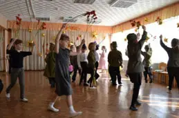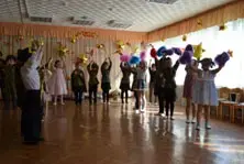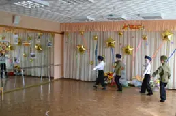 На третий куплет дети идут свободно по залу. На припев движения повторяются. В конце песни дети выстраиваются так: дети с гвоздиками в шеренгу, дети с лентами и салютиками в две колонны по бокам.