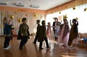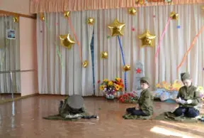 (Звучит музыка. Вторая группа детей: две девочки окружают мальчика - "солдата", дают ему теплые носки, перчатки.)