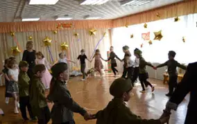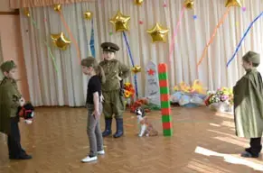 (Третья группа детей: две девочки и два мальчика - "солдата".)