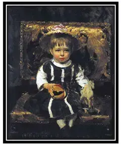 У ребенка темные волосы, нарядная шляпка с цветком. Белые рукава платья, белый воротник и полоски придают платью праздничность. На темном фоне выделяется золотистого цвета спинка стула, как будто солнечные лучи падают на край спинки стула и на детское лицо. Глаза выразительные, смотрящие вдаль. У девочки в руках игрушки: мячик и лошадка.