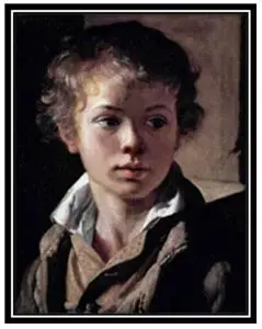 Темные глаза серьезны. Пытливый взгляд на чем-то сосредоточен. Трогательные детские губы. Лицо мальчика изображено в пол-оборота. Взгляд у мальчика очень внимательный и серьезный, свидетельствующий об уме и любознательности. Мальчик задумчиво смотрит вдаль. Лицо светлым пятном выделяется на фоне и приковывает внимание зрителя.