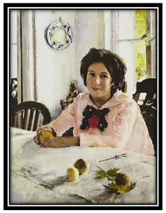 В руках у девочки персик, такой же смугло-розовый, как ее лицо. На ослепительно белой скатерти лежат вянущие листья клена, персики и серебряный нож. За окном светлый летний день, солнце, пробравшись сквозь листву, освещает и тихую комнату, и девочку, и старинную мебель красного дерева.