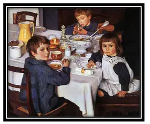 Картина "За обедом" (другое название - "За завтраком") является одной из самых известных в творчестве русской художницы Зинаиды Серебряковой. На ней изображены собственные дети художницы. Мать запечатлела их сидящими за столом в ожидании трапезы.