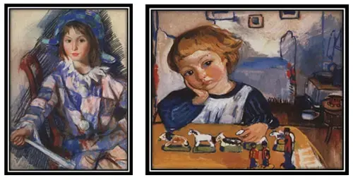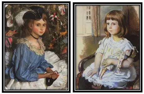 И.Е.Репин "Стрекоза", "Портрет В.И. Репиной, дочери художника в детстве";А.Г.Венецианов "Захарка"; В.А.Тропинина "Портрет Арсения- сына художника", В.А. Серов "Мика Морозов", "Девочка с персиками", З. Е. Серебрякова "За завтраком", "Портрет Таты в костюме Арлекино", "Портрет Жени Серебрякова", "Катя в голубом платье", "Девочка с куклой".
