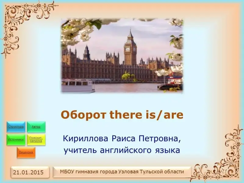 Конспект классной работы по теме презентации. Домашнее задание по окончании урока: Повторить основные ключевые лексические единицы (слайды 2-13) и примеры предложений с оборотом there is/are. |