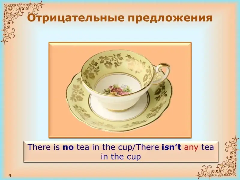 Отрицательная форма оборота образуется при помощи местоимения no перед существительным. Местоимение no исключает употребление артикля перед существительным. 0. Например: There is no book in my bag/ В моём портфеле нет книги. Это предложение можно сказать и так: There isn't a book in my bag. 1. Прочтите и переведите: There are no toys in the room. - В комнате нет игрушек. Можно употребить в этом примере неопределённое местоимение any с отрицательным сказуемым aren't: There aren't any toys in the room. 2. There is no milk in the jug. - В кувшине нет молока. С неисчисляемыми существительными также употребляется слово any, однако сказуемое стоит в единственном числе: There isn't any milk in the jug./ В кувшине нет молока. 3. Прочтите и переведите на русский язык: There is no tea in the cup/There isn't any tea in the cup. - В чашке нет чая. Переход - по щелчку |