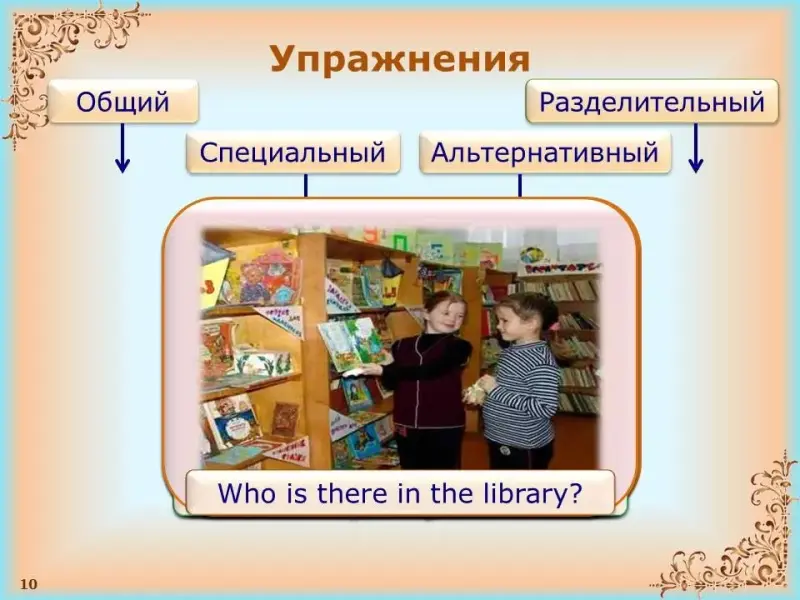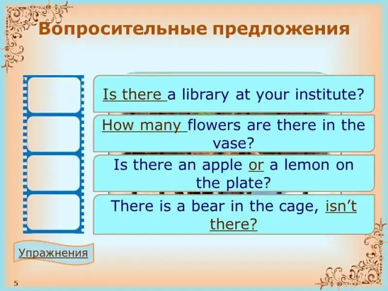 К предложениям с оборотом there is/are можно поставить четыре типа вопросов: 0-1.общие; 2. специальные; 3. альтернативные; 4. разделительные. 5. Общие вопросы задаются собеседнику с целью получить подтверждение или отрицание высказанной мысли, т. е. он требует ответа "да" или "нет". Общий вопрос начинают с оборота Is/are there...? Например: Is there a library at your institute?/В институте есть библиотека? На общий вопрос обычно дают краткий ответ (упражнения по гиперссылке). 6. Специальные воросы задают с целью получить полный ответ на интересующий вопрос. Специальный вопрос начинают с вопросительного слова, далее следует is/are there. Глядя на вазу с цветами можно спросить: How many flowers are there in the vase?/Сколько цветов в вазе? (упражнения по гиперссылке). 7. Особенностью альтернативных вопросов является выбор между двумя объектами. Этот вопрос обязательно содержит союз or и начинается с оборота Is/are there... Например: Is there an apple or a lemon on the plate?/На тарелке яблоко или лимон? Ответы на альтернативные вопросы обычно даются в полной форме: There is an apple on the plate. /На тарелке - яблоко. Ответ со словом yes/no дать нельзя. (упражнения по гиперсылке) 8. Разделительный вопрос представляет собой утвердительное или отрицательное повествовательное предложение, к которому присоединён краткий общий вопрос, состоящий из фраз isn't/is there, aren't/are there?, что в переводе означает "не так ли?". Следует помнить, если предложение отрицательное, краткий вопрос - утвердительный и наоборот. Например:There is a bear in the cage, isn't there? Ответы на разделительные вопросы обычно даются краткие. Например: Yes, there is. (упражнения по гиперссылке). 9. Упражнения (переход по гиперссылке). Переход - по щелчку. |