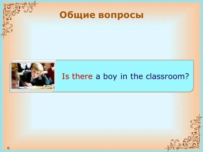 Общие вопросы строятся так: глагол to be ставится перед there: 0. Is there a Zoo in the city? - В городе есть зоопарк? Краткий ответ: Yes, there is. 1. Если глагол to be употреблён в сложном времени, то на первое место выносится вспомогательный глагол: Will there be English tomorrow?/ Завтра будет английский? - Yes, there will (be) 2. Is there a boy in the classroom?/ В классе мальчик? - Yes, there is. |