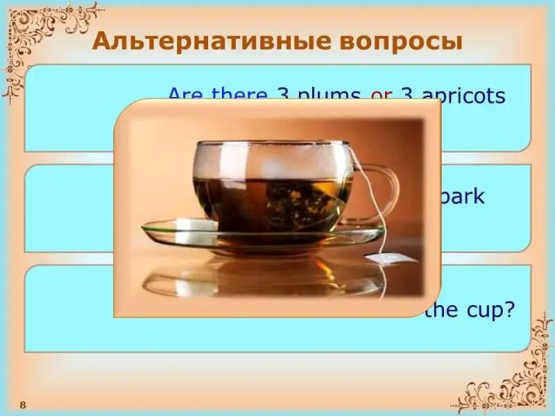 Тренируемся задавать подобные вопросы и отвечать на них. Помним, что ответы "да/нет" давать нельзя. 0 - 1. Are there 3 plums or 3 apricots on the table?/ На столе 3 сливы или 3 абрикоса? Ответ на этот вопрос требует употребления союза neither...nor/ни...ни: There are neither 3 plums nor 3 apricots on the table. There are 3 apples on the table/ На столе нет ни трёх слив, ни трёх абрикос. На столе - 3 яблока. Обратите внимание: в английском предложении может быть только одно отрицание. При отрицательном союзе neither...nor сказуемое стоит в утвердительной форме. 2. Are there children in the park or in the forest?/ В парке или в лесу дети? Можно ответить так: They (они) are in the park. 3. Вопрос к картинке №3 звучит так: Is there tea or water in the cup? Здесь речь идёт о неисчисляемом существительном, следует употребить глагол to be в единственном числе. Ответим так: There is some tea in the cup, употребив неопределённое местоимение some. |